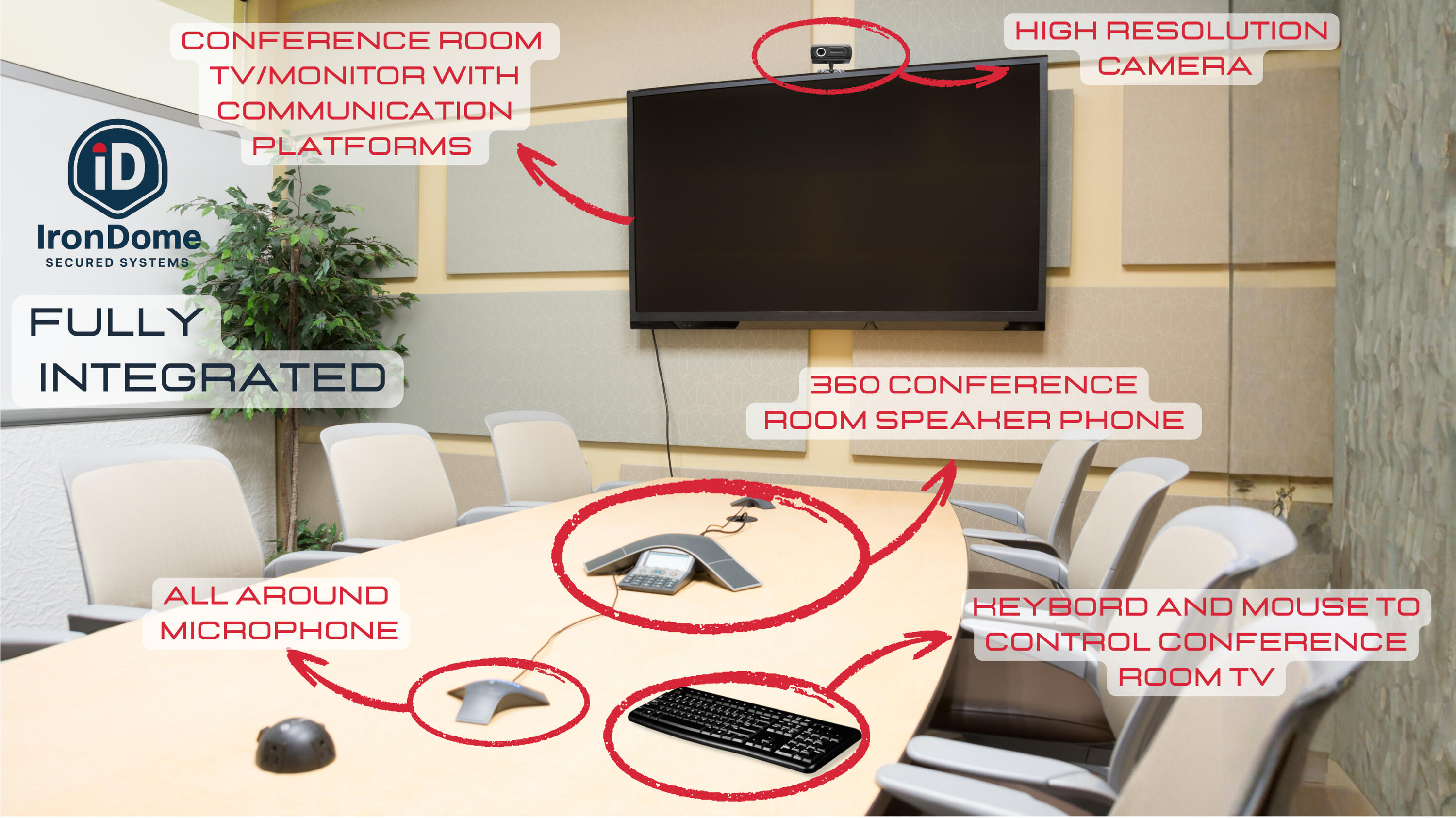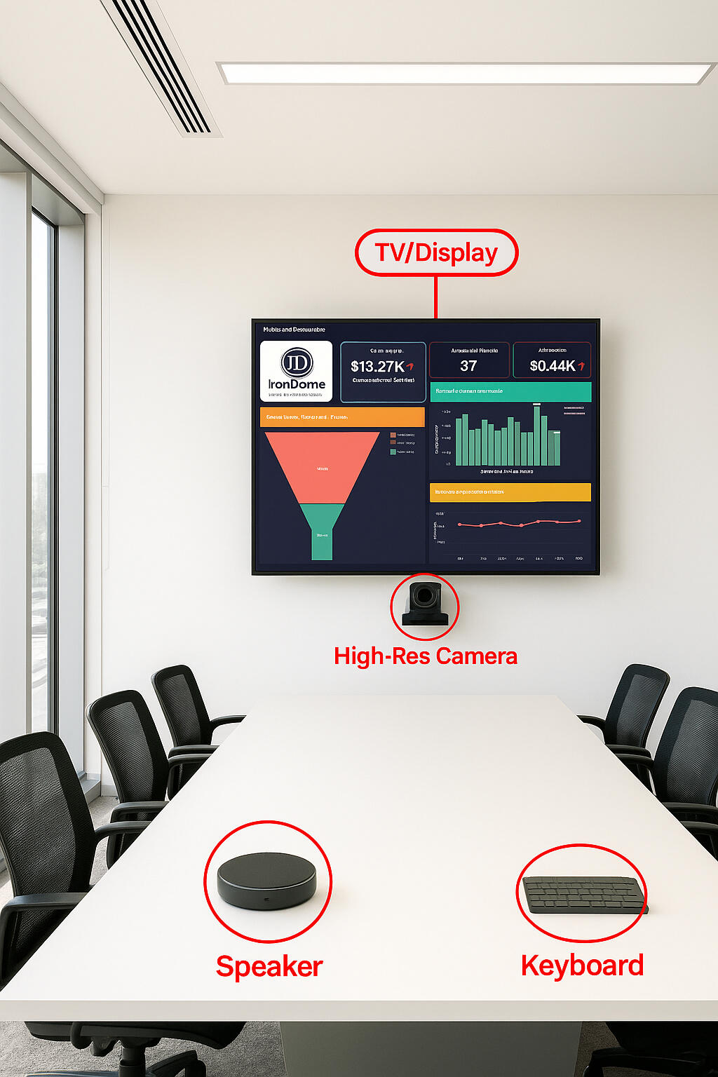 Our dedicated expert team can transform your old spaces into a top of the line technology conference room: TV displays, HI-FI cameras*, 360° speakers, and controls for seamless presentations on remote business calls.